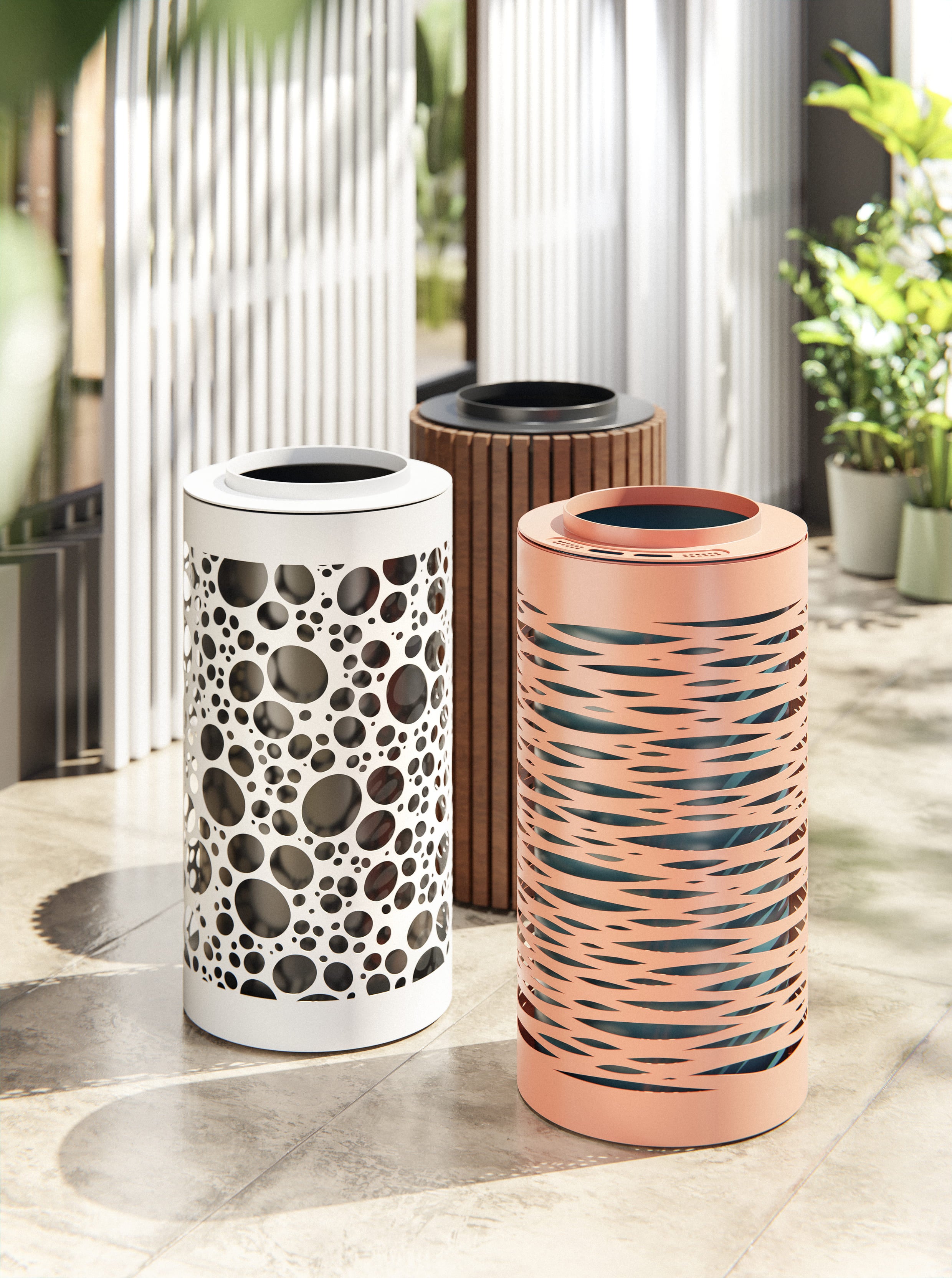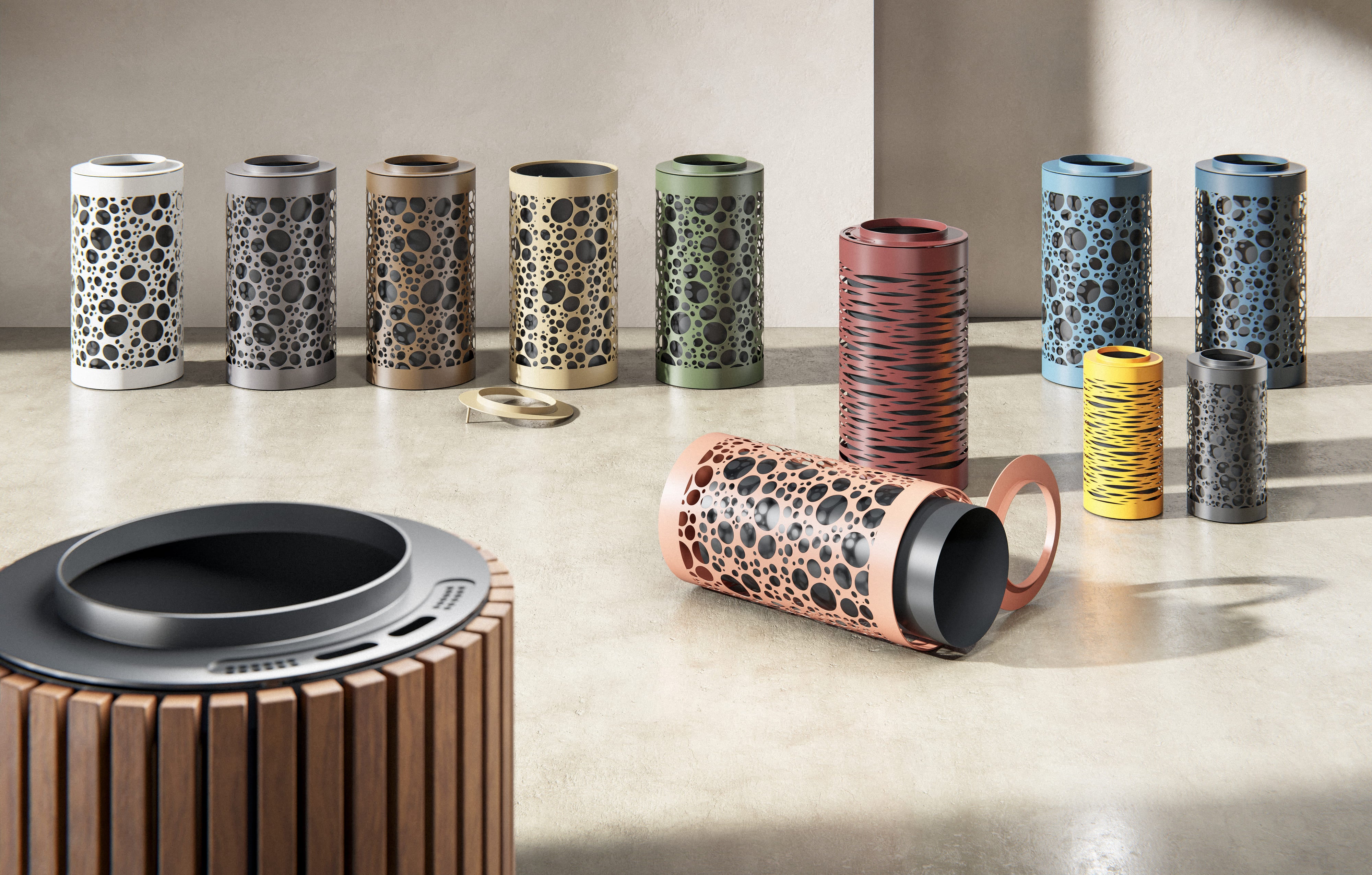 Beholderen er konstrueret af to cylindre: en ydre cylinder, som er dekorativ og kan udskiftes med trælameller, og en indre cylinder, som holder affaldsposen. Kombinationen giver både funktionalitet, holdbarhed og fleksibilitet i udtryk.
