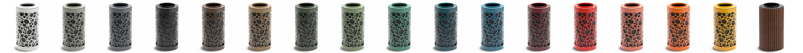 Nyon fås i to størrelser, tre designvarianter og flere farver. Den kan leveres i klassisk pulverlakeret stål til indendørs brug eller i en elegant version med cedertræslameller, som gør den ideel til udendørs miljøer. Det gør Nyon perfekt til alt fra moderne kontormiljøer til parker og byrum.