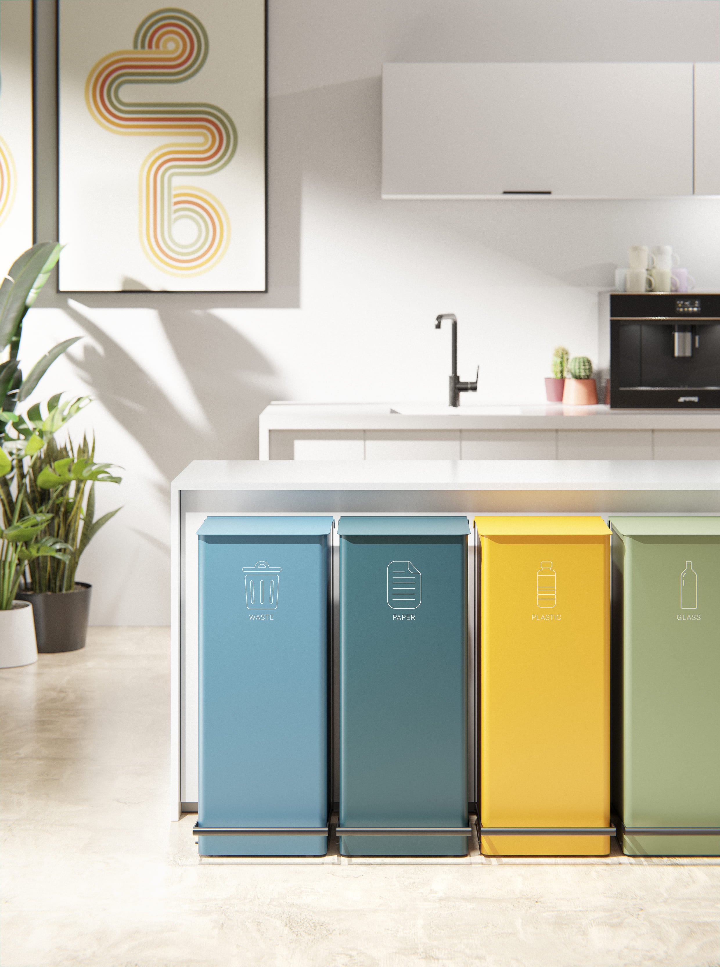 De container is vervaardigd uit 1,5 mm staalplaat en wordt geleverd met een binnenring die de afvalzak stevig op zijn plaats houdt. De basis is uitgerust met rubberen voetjes die het oppervlak beschermen tegen krassen en stabiliteit bieden. Thun is verkrijgbaar in drie verschillende maten en in een breed scala aan kleurcombinaties, met de mogelijkheid voor pictogrammen, zodat afvalscheiding kan worden aangepast aan zowel behoeften als inrichting.
