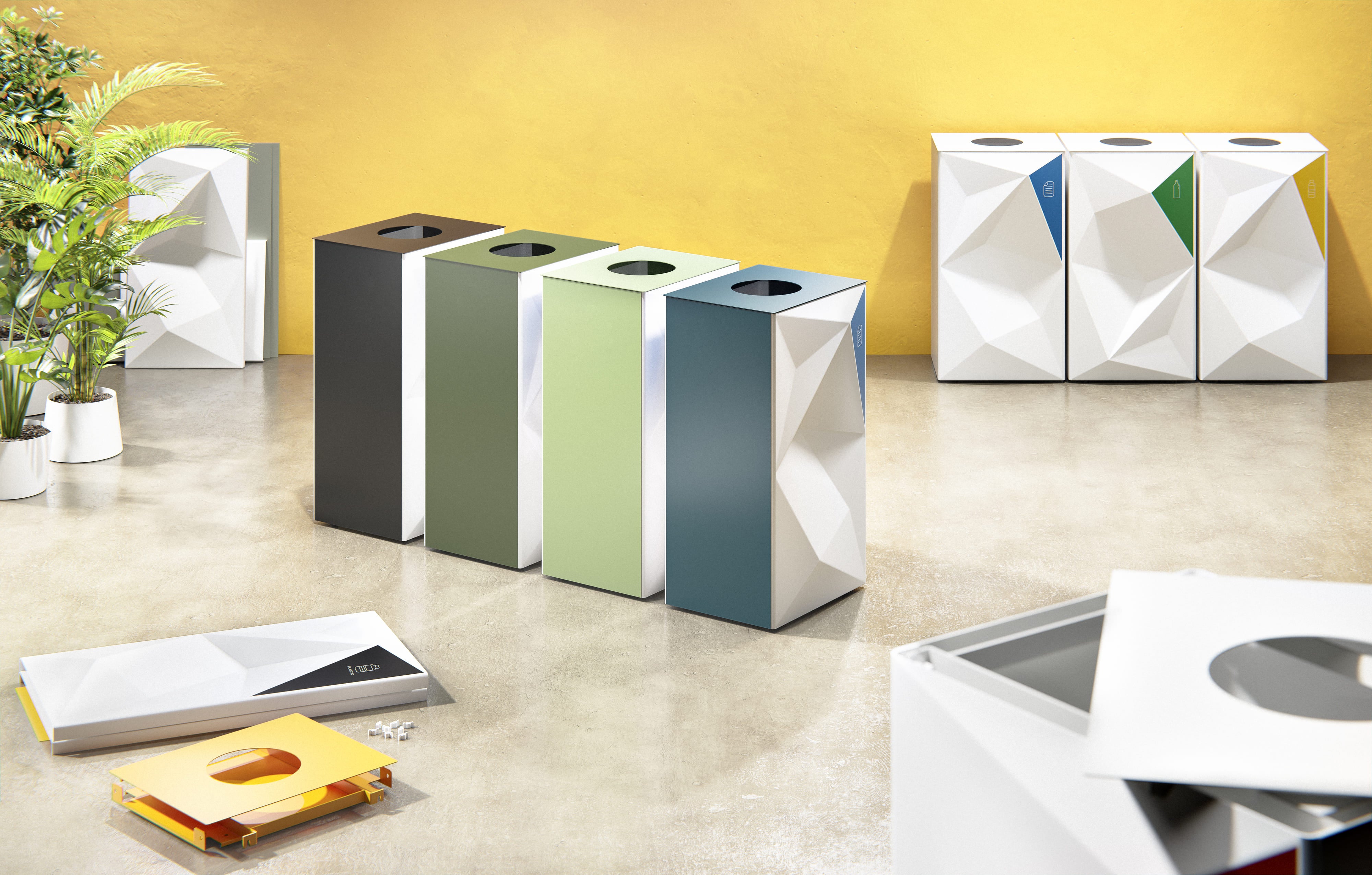 De container is vervaardigd uit 1,2 mm staalplaat met voor- en achterkanten van 3 mm slagvast thermoplast (polystyreen), wat een mooi contrast tussen de materialen geeft. Hij heeft een afneembaar deksel, een binnenring van staal om de zak op zijn plaats te houden en een basis met rubberen voetjes die de ondergrond beschermt.